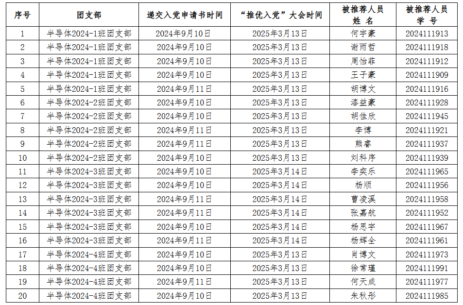 2025年3月17日,经支部委员会研究,确定何宇豪等二十名同志为入党积极分子。根据党章和发展党员工作有关要求,现将其有关情况公示如下: