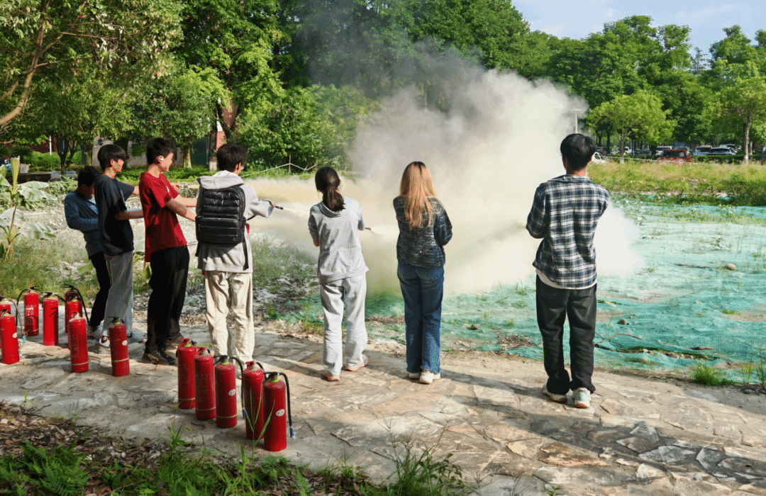 进入实操环节后,同学们在专业人员的指导下,以班级为单位,6人一组依次展开灭火操作。在老师的耐心指导下,他们按照“提、拔、握、压”的标准动作,逐步完成了灭火操作,亲身体验了灭火的实际操作,将理论知识转化为实践技能,提升应急处突能力。