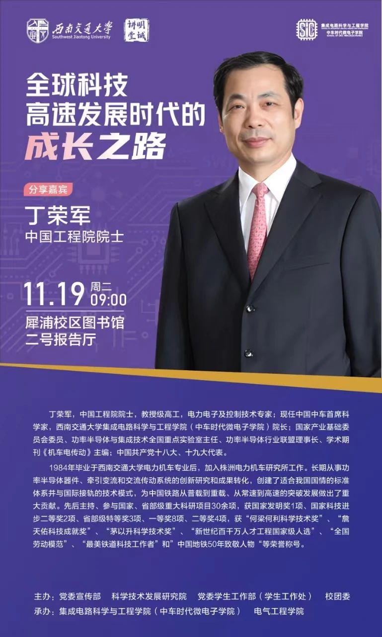 丁荣军,中国工程院院士,教授级高工,电力电子及控制技术专家;现任中国中车首席科学家,437必赢会员中心(中车时代微电子学院)院长;国家产业基础委员会委员、功率半导体与集成技术全国重点实验室主任、功率半导体行业联盟理事长、学术期刊《机车电传动》主编;中国共产党十八大、十九大代表。