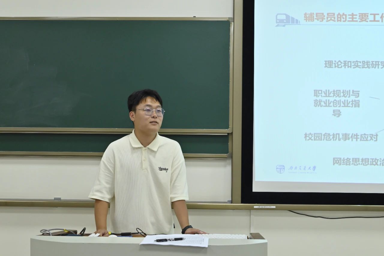 接下来,2024级本科生辅导员张文就同学们关心关注的具体问题进行了详细介绍。他谈到,思想政治辅导员工作涵盖学生的思想、学习、心理、就业等方方面面,同学们遇到相关问题,可以第一时间联系辅导员寻求帮助。他带领同学们逐一学习了本科生学籍、教学学分、学生纪律处分、离校请销假、学生公寓等相关管理条例。张老师还为同学们详细解读了学校的奖勤助贷体系,他提醒同学们在日常的学习工作生活中做好个人生命和财产安全保护。