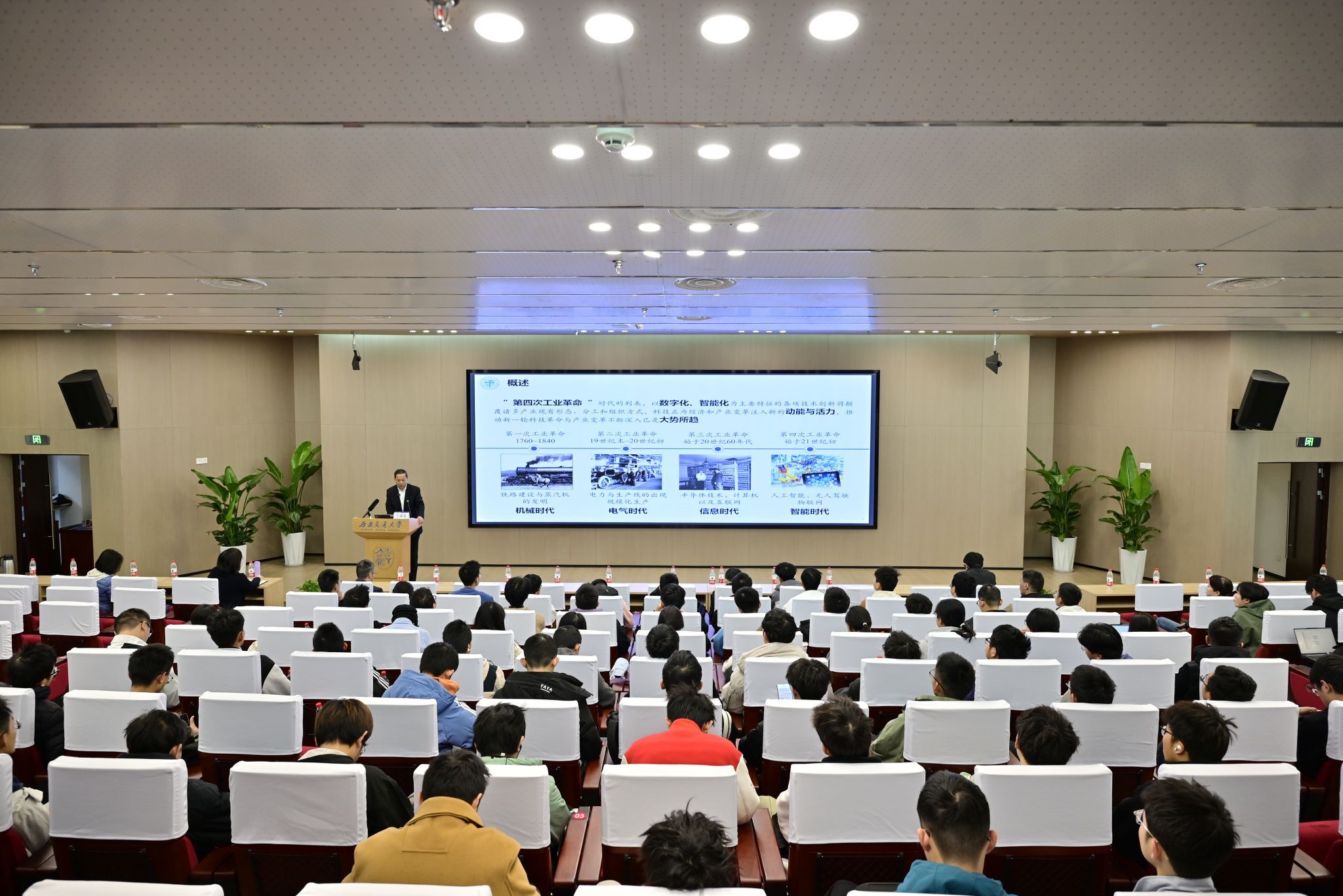 丁荣军院士深入剖析科技创新在经济与产业变革中的核心驱动力。他表示,数字化与智能化浪潮正重塑全球产业格局,科技创新加速迭代,深刻改变人类社会发展轨迹。他聚焦数字化转型、颠覆性技术涌现等关键特征,介绍人工智能、自动驾驶、大数据、机器人、无线传感、量子计算等科技前沿热点,向在场师生们展现了科技创新与人类社会深度融合的全景图。